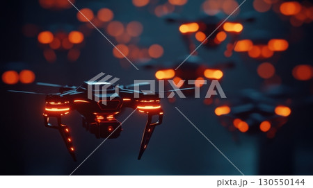 Futuristic drones flying in a dark atmosphere with glowing lights