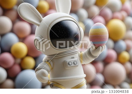 Cute child-sized astronaut character holding colorful egg among pastel spheres in the background