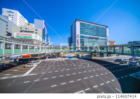 日本の横浜都市景観 歩道橋のある街…新横浜駅などを望む。駅前の道路整備も完了…希望の光…=7日