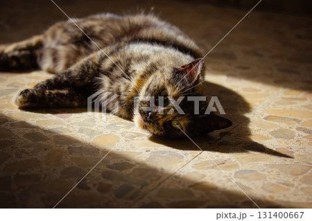A tabby cat enjoys the warmth of the sun relaxing on the stone floor Three-colored tortoiseshell cat lounges on sunlit floor, basking in a warm light.