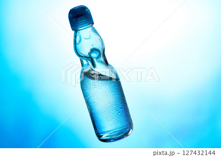 冷えたラムネ、青の背景に日本の伝統的な夏の飲み物。