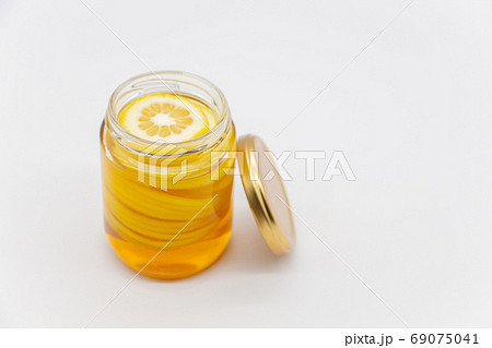 瓶詰の蜂蜜レモンと小皿に取り分けた一枚のレモン