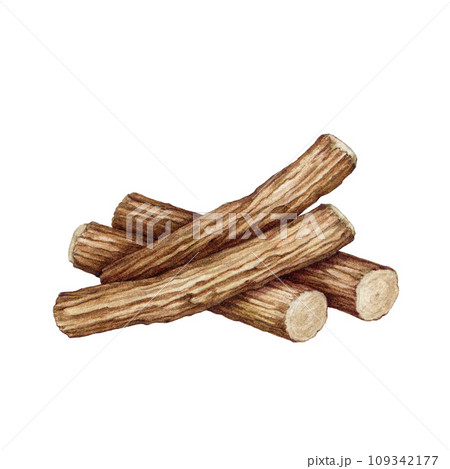 Licorice plant dry root pile. Glycyrrhiza glabra botanical illustration. Hand drawn liqourice herb dry root pile element. Licorice medicinal plant edible sweet part. isolated on white background