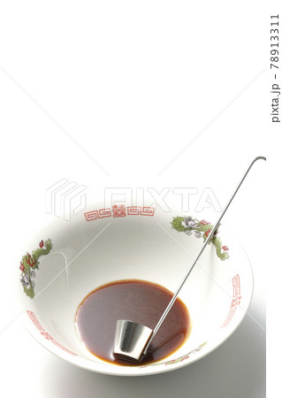 ラーメンどんぶりに醤油ラーメンの元とレードルが入ってる様子を白背景で撮影