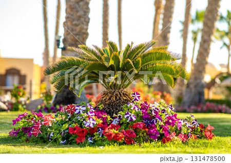 Small green palm tree surrounded with bright blooming flowers growing on grass covered lawn in tropic hotel yard.