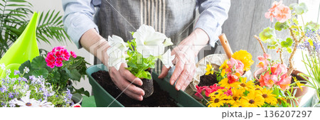 Spring decoration of a home balcony or terrace with flowers, man planting flowers Petunia in pots, flowers on a green background, home gardening and hobbies, banner