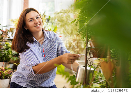 Beautiful brunette woman houseplant growth hobby watering potted plant at home garden closeup