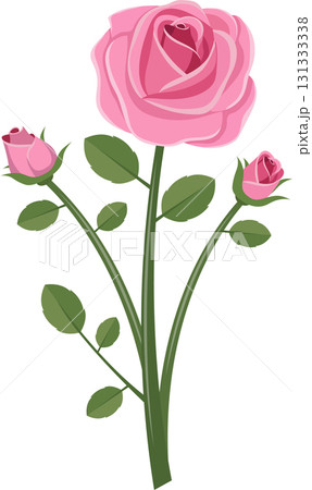 Stylized Illustration: Pink Rose with Two Buds on Dark Background, Flat Vector Graphics