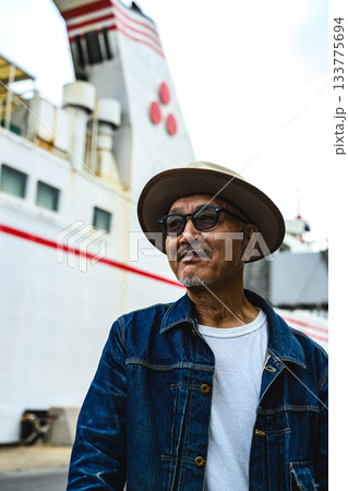 フェリーを背景に佇む麦わら帽子をかぶった中高年の男性