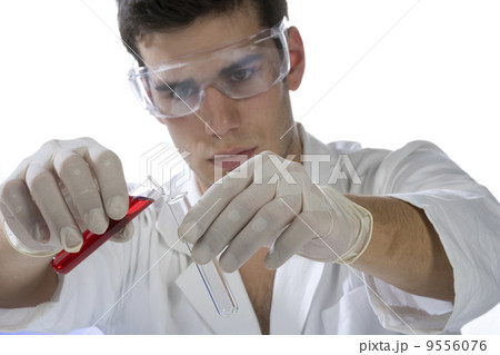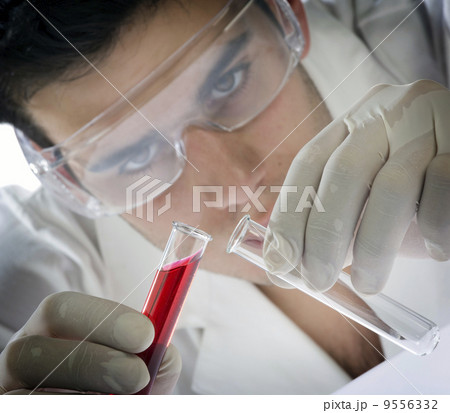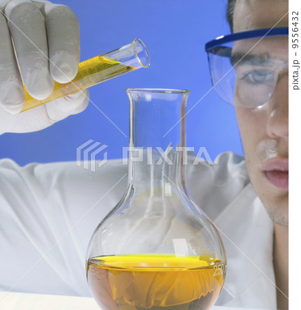 Medical or research scientist or doctor using looking at a test tube of clear solution in a lab or laboratory.