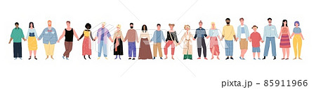 Flat cartoon happy characters holding hands-equality,diversity,international friendship and solidarity vector illustration