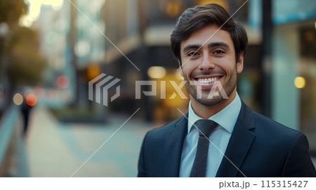 Professional Businessman Smiling on City Street, Hispanic Heritage, Young Professional for Corporate Use