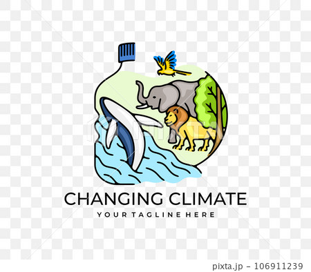 Changing climate, animals, plants, fish and birds, colored graphic design. Ecosystem, lion, elephant, macaw parrot, whale, ocean and trees, vector design and illustration