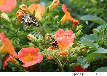 凌霄花の花蜜を吸いに来たアゲハチョウ