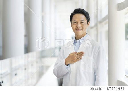胸に手を当てた白衣を着たカメラ目線で笑顔の30代の男性 医療従事者・研究者 イメージ