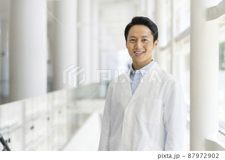 白衣を着たカメラ目線で笑顔の30代の男性 医療従事者・研究者 イメージ