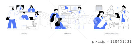 Medical college classes isolated cartoon vector illustrations set. Lecture and seminar, laboratory course, teaching assistant to medical students, university educational process vector cartoon.