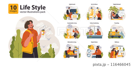Modern wellbeing practice set. Slow, mindfull and sustainable living. Modern urban lifestyle principles for harmony. Personal growth, stress reduction and happiness. Flat vector illustration