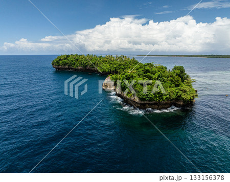 Steep rocky islets covered with green forest rising from blue ocean water. Siargao, Philippines.