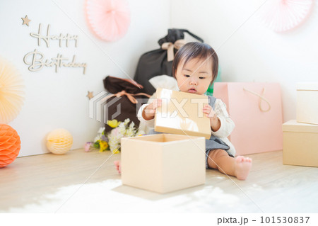 プレゼントボックスを開ける元気な赤ちゃん 1歳の誕生日 ファーストバースデー