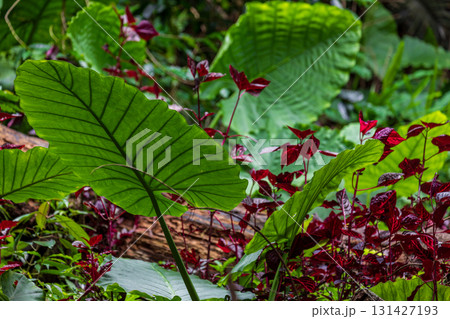 Tropical green leaves, dark green leaves and bushes, fresh and rainy, nature background