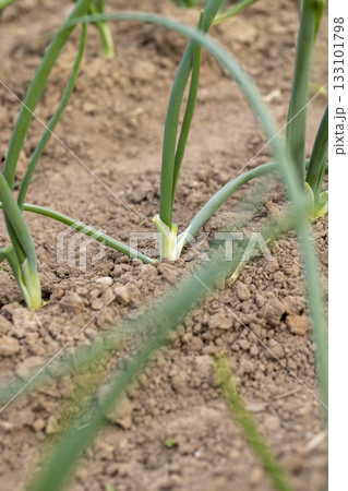 green onions growing in an agricultural field, dry summer weather with soil, the need for maintenance and watering of green onions