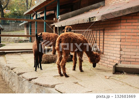 Group of brown alpacas feeding on hay near a brick building at Belgrade Zoo in autumn. Cozy rural atmosphere and warm light