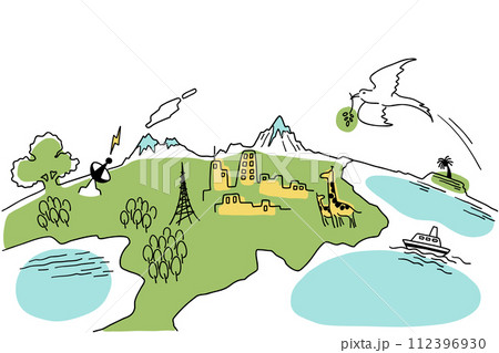自然や町が共生する地球のイメージ線画イラスト 白黒