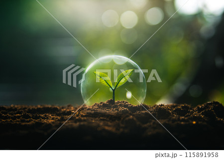 Nature conservation concept, young tree growing in a glass ball on the ground and nature background
