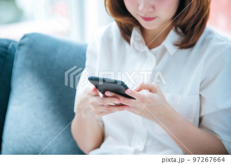 Asian woman holding smartphone with E-commerce Shopping online website Reading Online Article, Blog, vlog. Young Woman hands holding phone technology lifestyle. Happy Woman using digital smart phone