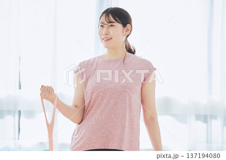 自宅でトレーニングチューブを使ってエクササイズをする30代女性のウェルネスライフ