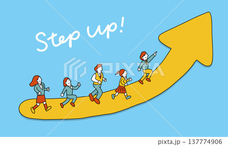 進級・新学期・新学年・成績アップなどのイメージ 上に向かう矢印の上を走る5人の学生のイラスト