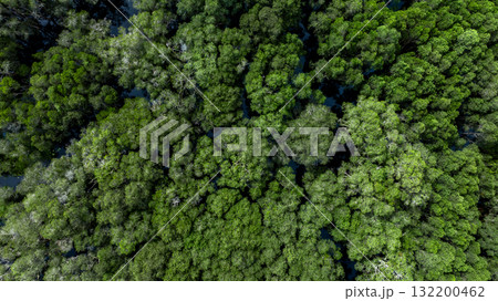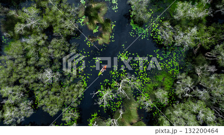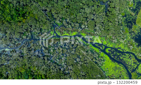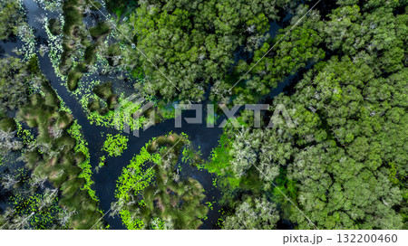 Aerial top view jungle wetlands wilderness, Wetlands crucial for biodiversity, Swamp landscape ecological reserve in wildlife, Greenery rural area with swamp.