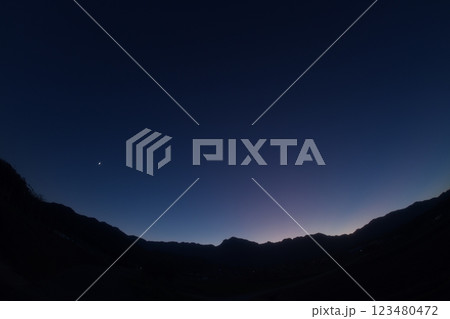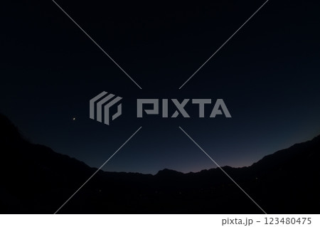 北杜市白州町、南アルプス甲斐駒ケ岳、夕暮に沈む細い月