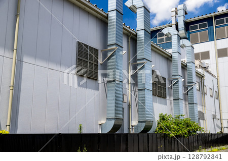 Exterior of industrial buildings. Factory with pipes and industrial elements.