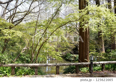 生田緑地にある奥の池を眺める 春の青空 神奈川県川崎市多摩区