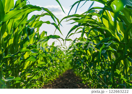 Young corn plants growing on the field on a sunny day. Fresh green sprouts of maize. Growing corn. Agrarian business. Agricultural scene. Selective focus