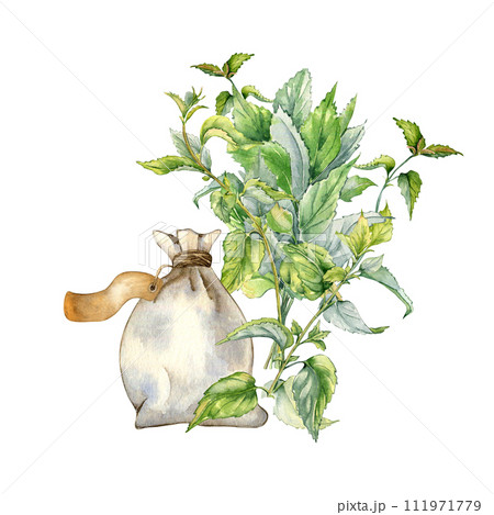 Herb sachet with label and bush of nettles in watercolor isolated on white. Illustration of the herbal plant Urticaria dioica. Bush of stinging plant hand drawn. Label, packaging, pharmacy design