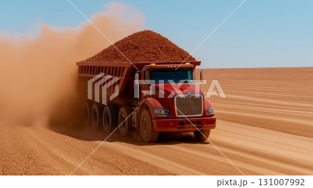 Heavy truck transporting sand across a dry landscape with dust clouds