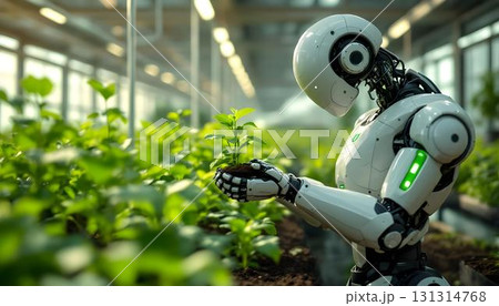 In a summer field, a robot cradles a plant, showcasing the intersection of technology and outdoor gardening