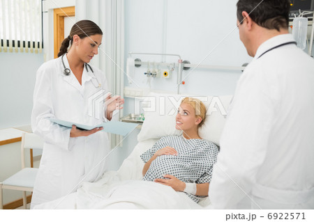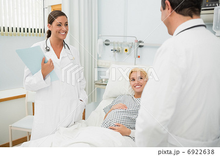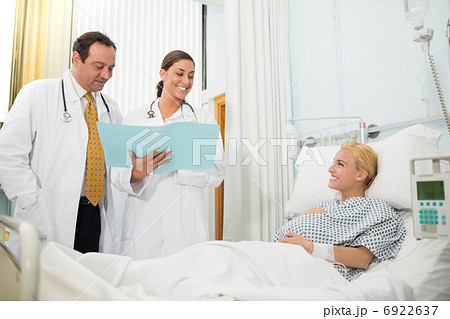Pregnant woman in her bed talking with doctors