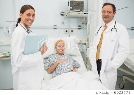 Female and male doctors standing next to a patient