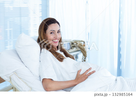 Smiling Pregnant Woman Sitting in Hospital Bed