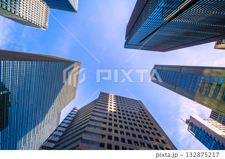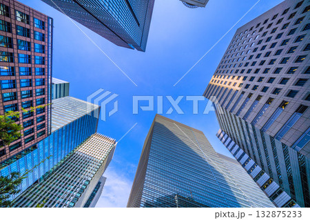 日本の東京都市景観 大手町のオフィス街やビルに反射する太陽光などを望む。新時代に希望の光