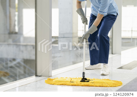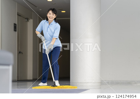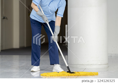 ビル清掃イメージ モップで床を拭く女性清掃スタッフ