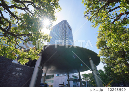 日本の東京都市景観 太陽光や東急電鉄 用賀駅などを望む