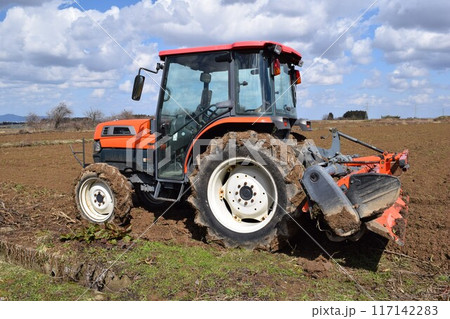 トラクターで畑起こしをしている畑の風景を撮影