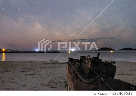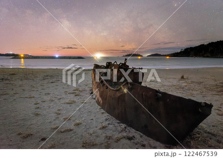 気仙沼市大島田中浜の廃船と夜明け前の天の川の風景