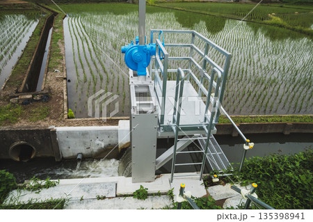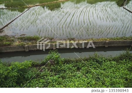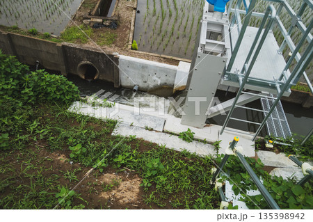 水量たっぷりの田圃の用水路 早々の田植え用 さいたま市