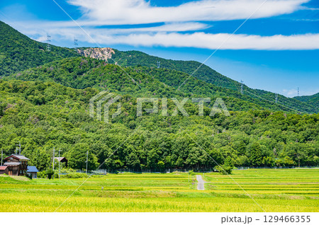 夏の青空と新緑の田んぼ風景